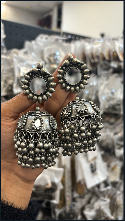 Add a touch of vintage charm to your look with these stunning Oxidized Silver Mirror Jhumkas. Featuring a bold sun-inspired stud and a classic bell-shaped drop, these earrings are intricately detailed with hand-placed mirrors and finished with a cascade of delicate metal beads.